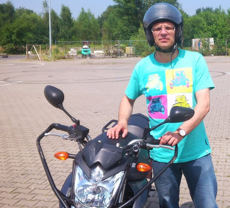 Dr Kraśnicki podczas nauki jazdy na motocyklu