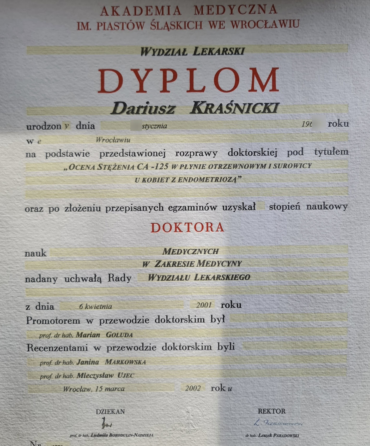 Tytuł doktora nauk medycznych po obronie pracy doktorskiej.